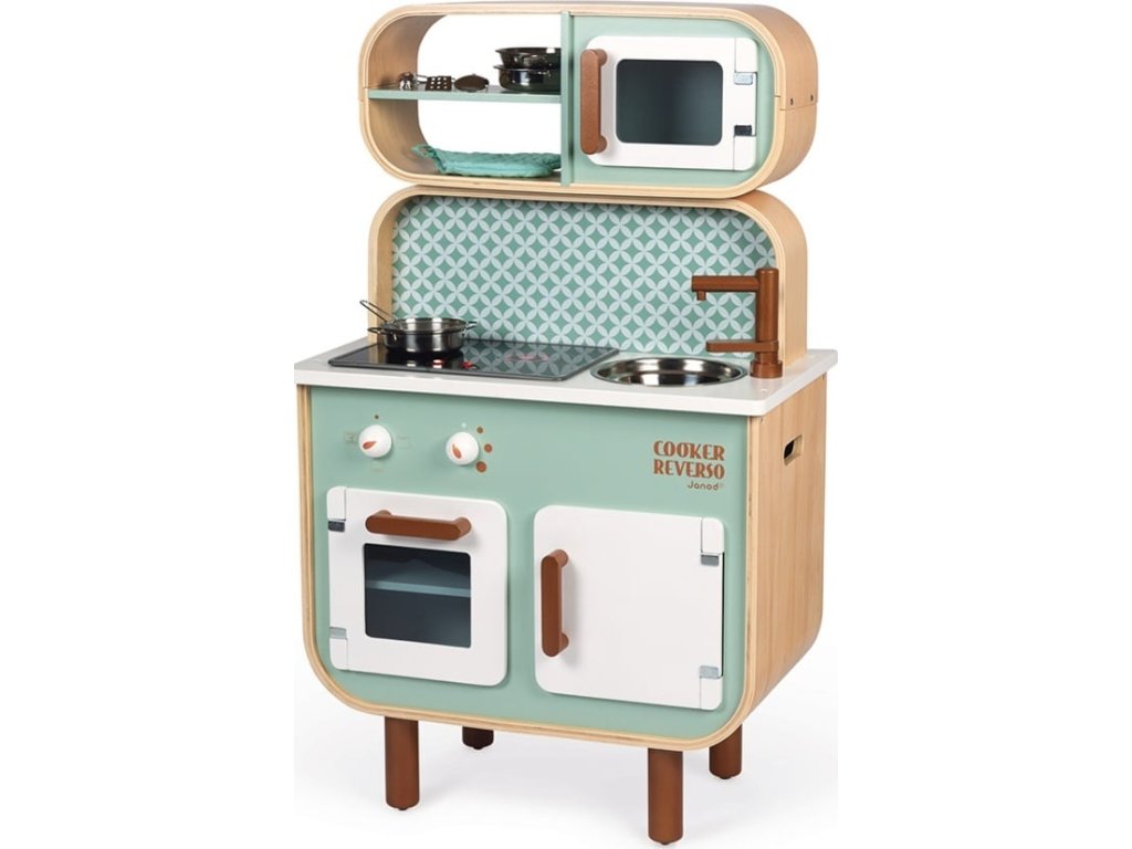 Detská drevená kuchynka Reverso Janod obojstranná s práčkou a príslušenstvom je v nádhernej kombinácii farieba tak je vhodná rovnako pre chlapcov ako aj pre dievčatá.