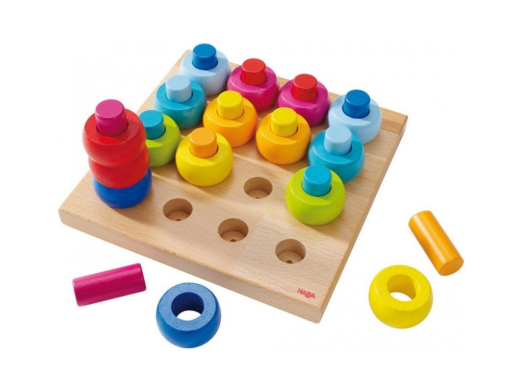 Pozostáva z pevnej drevenej podložky o rozmere 18,5 x 18,5 cm, v ktorej je 16 dierok určených na zastrkávanie drevených kolíkov a na ne krúžkov. Možností či farebných kombinácií je neúrekom, stačí sa len pustiť do hrania a zapojiť fantáziu!