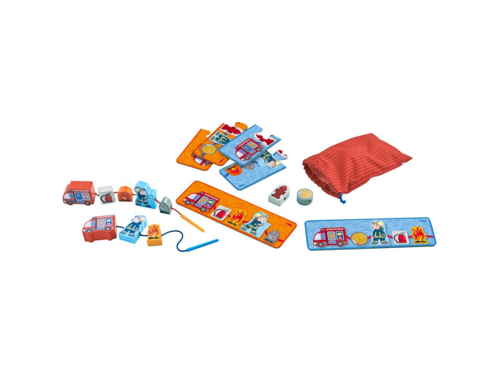 Podporte u svojich detí jemnú motoriku, úchop, koordináciu oko-ruka, sústredenosť, trpezlivosť, hmatové i vizuálne vnímanie, zmysel pre detail, ale aj pozornosť, predstavivosť či fantáziu. Urobte tak s naším navliekacím a skladacím setom z dielne nemeckej značky Haba, ktorý je svojím štýlom a vizuálnym prevedením vhodný najmä pre chlapcov. S jednou sadou dokážu súčasne pracovať 2 deti. Hra je vhodná aj na cestovanie a má tiež edukatívny charakter - deti sa prostredníctvom nej naučia, ako uhasiť požiar.Obsah balenia: 10 dielov (2 požiarne vozidlá s navliekacou šnúrou, 4 obojstranné puzzle predlohy, textilné vrecúško na sťahovanie, 2 figúrky hasičov, veľký horiaci plameň, tlejúci plameň, hydrant, hadica, hasiaci prístroj)Materiálové zloženie: drevo, kartón, polyesterRozmery: 22 x 22 x 6,3 cmOdporúčaný vek: 2 roky a viac