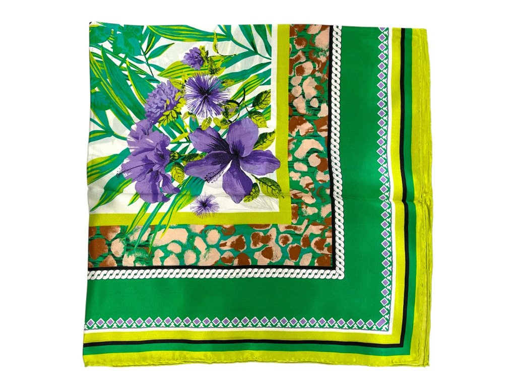 HEDVÁBNÝ ŠÁTEK - Fialové květy se zeleným okrajem