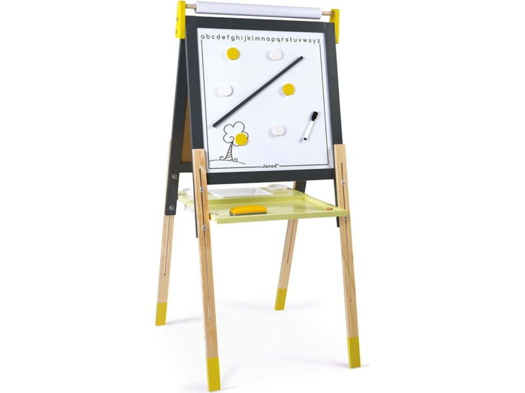 Obojstraná magnetická tabuľa, ktorá rastie s dieťaťom - má 4 drevené výškovo nastaviteľné nohy a magnetky veselých farieb!